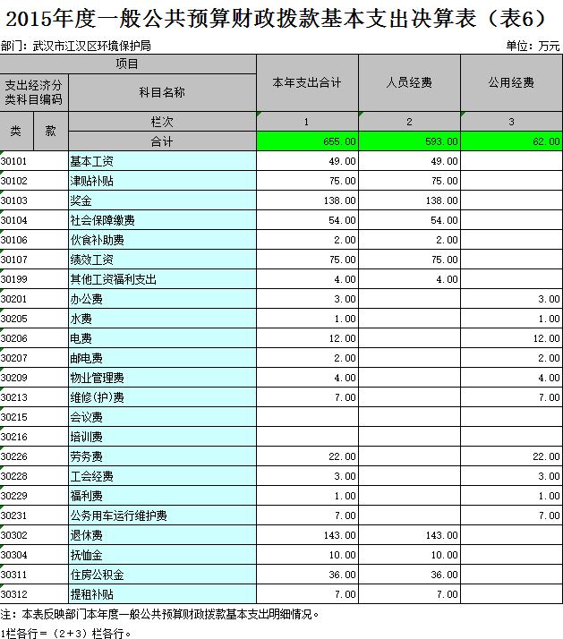 2015度一般公共预算财政拨款基本支出655万元,其中,人员经费593万元,主要包括:基本工资、津贴补贴、奖金、社会保障缴费、绩效工资、其他工资福利支出、离休费、退休费、抚恤金、退职(役)费、抚恤金、生活补助、救济费、医疗费、助学金、奖励金、生产补贴、住房公积金、提租补贴、购房补贴、其他对个人和家庭的补助支出;公用经费62万元,主要包括:办公费、印刷费、咨询费、手续费、水费、电费、邮电费、取暖费、物业管理费、差旅费、因公出国(境)费、维修(护)费、租赁费、会议费、培训费、公务接待费、专用材料费、被装购置费、专用燃料费、劳务费、委托业务费、工会经费、福利费、公务用车运行维护费、其他交通费用、税金及附加费用、其他商品和服务支出。