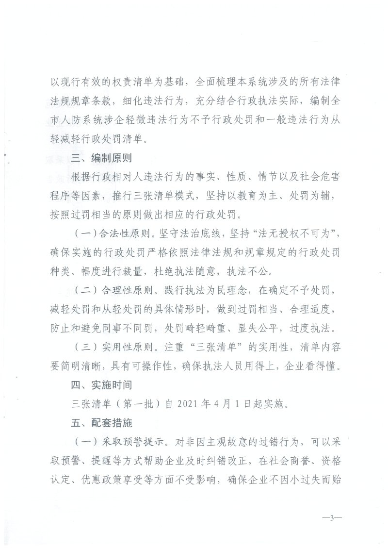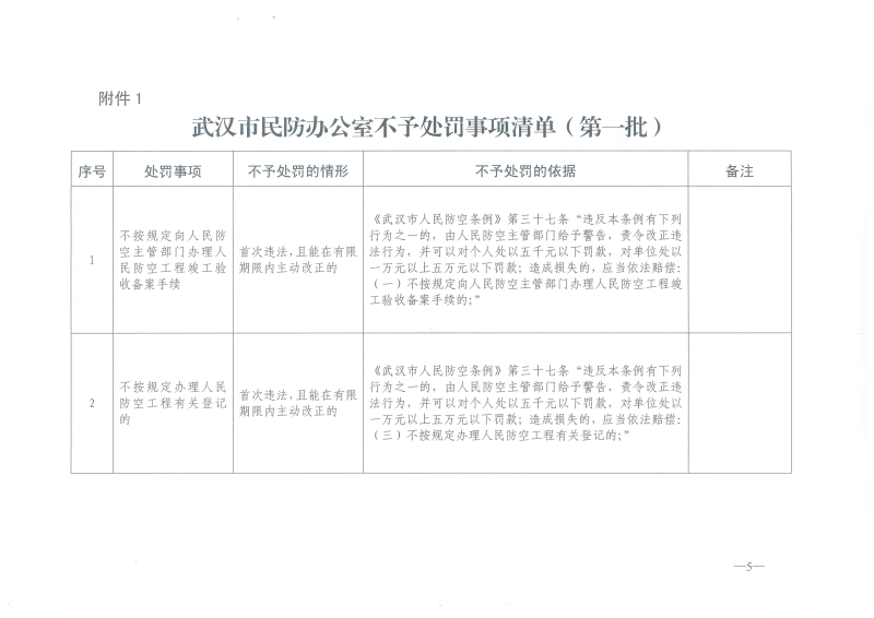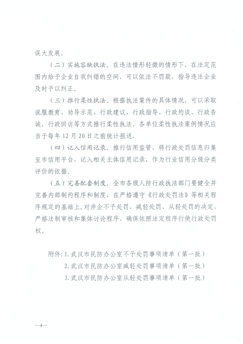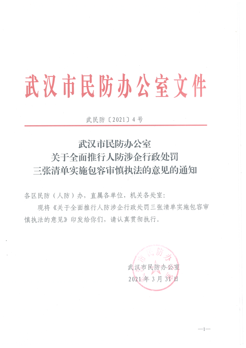 | 标 题 | 武汉市民防办公室关于全面推行人防涉企行政处罚三张清单实施包容审慎执法的意见 | ||