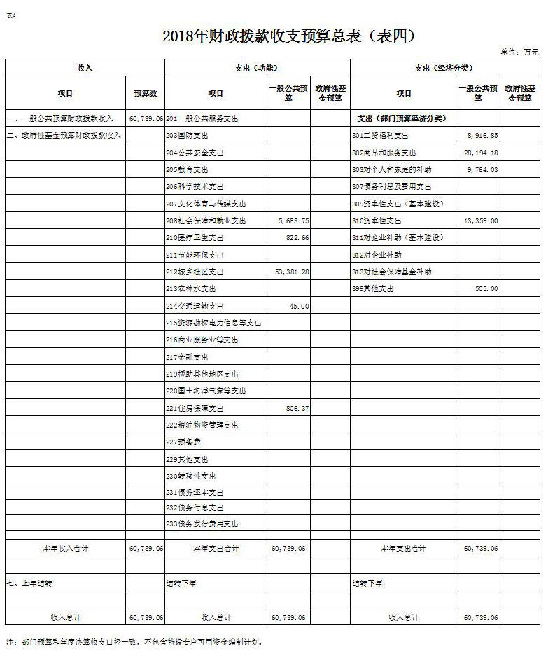2018年财政拨款(补助)预算数60739.06万元,比2017年财政预算拨款收入36759.08万元增加23979.98万元,增幅65%,安排情况如下: