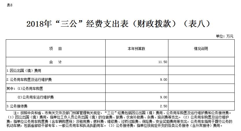 2018年部门财政拨款资金安排“三公”经费预算11.5万元。具体情况如下: