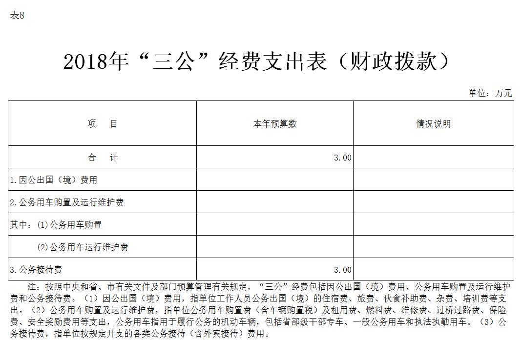 2018年部门财政拨款资金安排“三公”经费预算3 万元。具体情况如下: