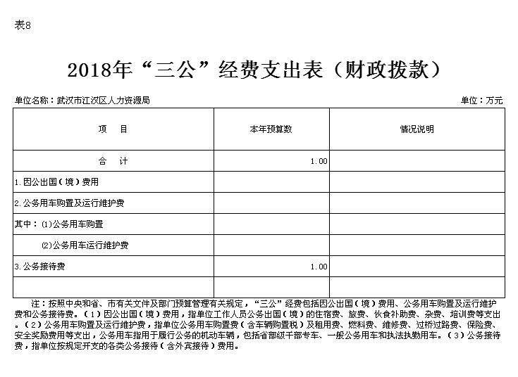 2018年部门财政拨款资金安排“三公”经费预算1.00万元。具体情况如下: