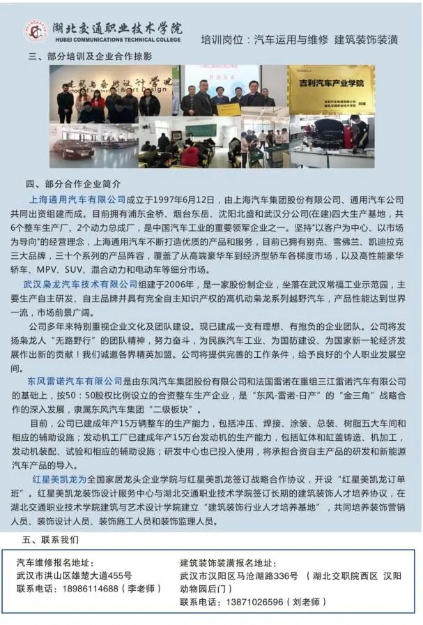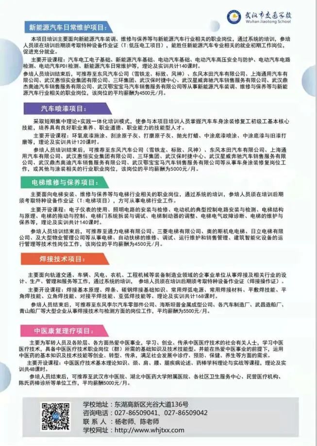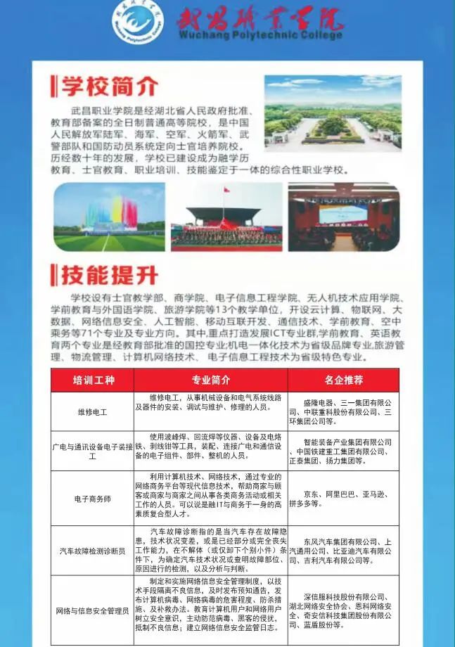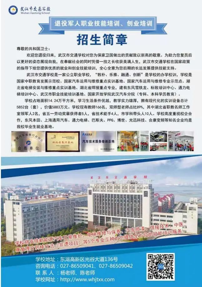 为做好退役军人职业技能培训工作,武汉市退役军人事务局今年考核并确定了全市45家职业教育和技能培训机构,面向退役军人开展免费职业教育和技能培训,退役军人可根据自身需求从中选择承训机构和所学专业接受培训。