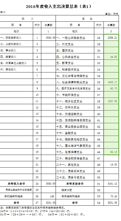 2016年度收入总计5083.95万元,支出总计5161.12万元。与2015年相比,收入增加732.95万元,增加 16.8%,主要原因是网格化工作试点增加网格员经费。支出增加 810.12万元,增加18%,主要原因是网格化工作试点增加网格员。