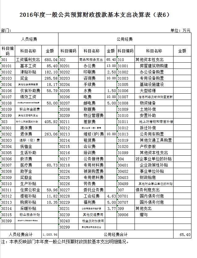 2016年度一般公共预算财政拨款基本支出1151.37万元,其中,人员经费1085.96万元,主要包括:基本工资、津贴补贴、奖金、社会保障缴费、绩效工资、其他工资福利支出、离休费、退休费、抚恤金、退职(役)费、抚恤金、生活补助、救济费、医疗费、助学金、奖励金、生产补贴、住房公积金、提租补贴、购房补贴、其他对个人和家庭的补助支出;公用经费65.40万元,主要包括:办公费、印刷费、咨询费、手续费、水费、电费、邮电费、取暖费、物业管理费、差旅费、因公出国(境)费、维修(护)费、租赁费、会议费、培训费、公务接待费、专用材料费、被装购置费、专用燃料费、劳务费、委托业务费、工会经费、福利费、公务用车运行维护费、其他交通费用、税金及附加费用、其他商品和服务支出;