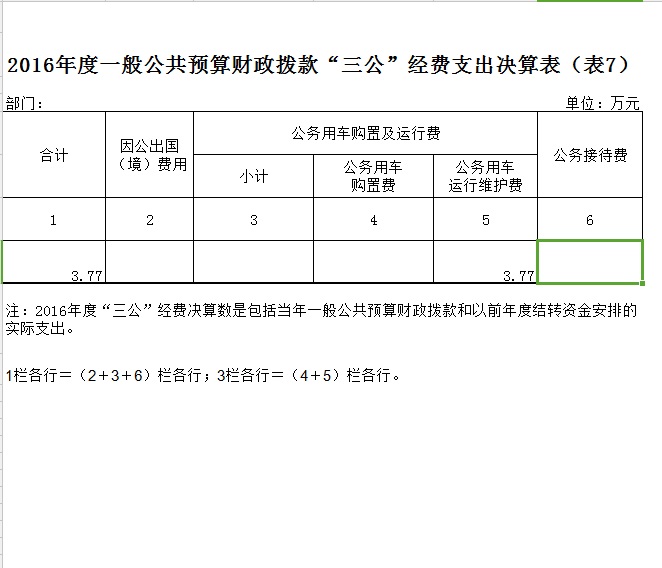 2016年度"三公"经费财政拨款年度预算为 5万元,支出决算为 3.77万元,完成预算的75.4%。其中: