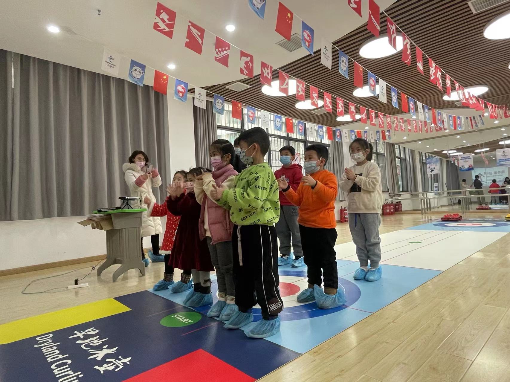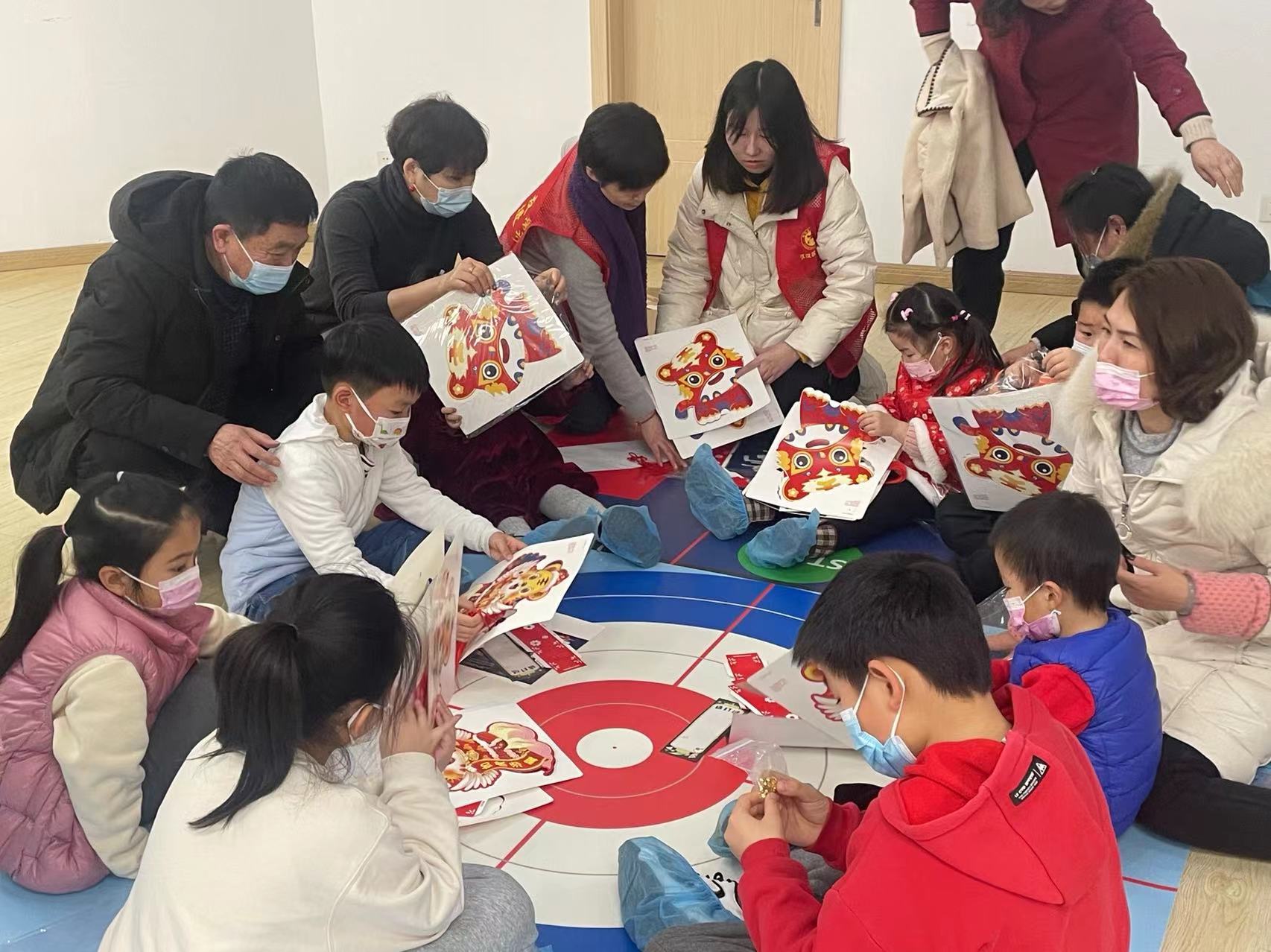 最近的人气顶流,冬奥吉祥物冰墩墩憨态可掬,由冬奥吉祥物、冬奥项目彩旗装饰的大厅、10米长的冰壶场地,一下把节日氛围拉到满格。家长和孩子们席地而坐,制作元宵灯笼,看冬奥精彩视频,学习冬奥会小知识,有关冬奥会的知识问答,把活动带入第一个高潮,小朋友们都非常积极的要求回答问题,甚至来不及举手就高呼出答案了!活动的高潮出现在亲子冰壶体验。武汉,一个南方滨江城市,大家普遍对冰上运动比较陌生,难得的旱地冰壶体验让家长和孩子都充满新奇感,认真听规则,积极推动手里的冰壶找感觉,调整姿态、大手扶着小手,每组家庭都沉浸在冰壶运动的快乐中。