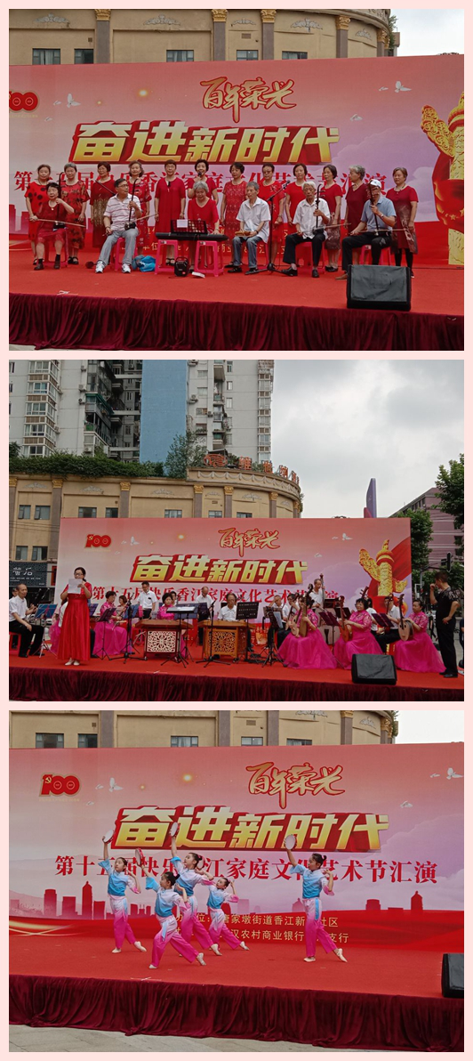 为热烈庆祝中国共产党成立100周年,唱响党的时代赞歌,深入开展社区居民精神文明建设,进一步丰富居民文体生活,加强居民之间的联系与沟通,提升社区党委的凝聚力、向心力,展现辖区“社会组织”文艺风采,展示社会组织的活力和特色,提高社会组织在广大居民中的认知度,社区党委于6月30日上午在菱角壹号广场举办主题为“百年荣光,奋进新时代”暨十五届香江文化艺术节大型文艺汇演活动。下沉单位区人力资源局、区菱角湖公园管理中心、武汉液压气动工业公司,共建单位武汉农村商业银行江汉支行、酒店偷拍 科协、以及环菱角商圈企业代表,以及社区直管党员、居民众积极参与其中。唐家墩街道办事处副主任付小清、党建办科长李妮、公服办科长余芳亲临汇演现场,付小清主任在现场为本届艺术节活动提出精彩致词。
