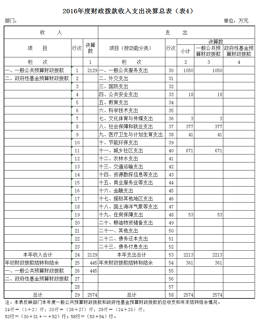 2016年度财政拨款(含政府性基金拨款)收支总计 2574 万元。与2015年相比,收入减少17万元,降低1%。主要原因是减去了弥补街道工作经费;支出增加223万元,增长11%;主要原因是不可预见经费增加。