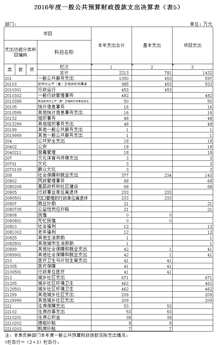 2016年一般公共预算财政拨款支出年度预算为2574万元(包括年初部门预算、基本建设等专项资金、上级下达的专项转移支付资金及年初结转和结余资金等支出),支出决算为 2213 万元,完成年度预算的 86 %。其中:基本支出 781 万元,项目支出 1432万元。