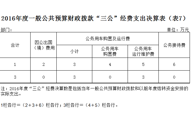 (十三)“三公”经费:指使用一般公共预算财政拨款安排的因公出国(境)费、公务用车购置及运行维护费和公务接待费。其中,因公出国(境)费用反映单位公务出国(境)的国际旅费、国外城市间交通费、住宿费、伙食费、培训费、公杂费等支出;公务用车购置及运行维护费反映单位公务用车车辆购置支出(含车辆购置税)及租用费、燃料费、维修费、过桥过路费、保险费、安全奖励费用等支出;公务接待费反映单位按规定开支的各类公务接待(含外宾接待)费用。