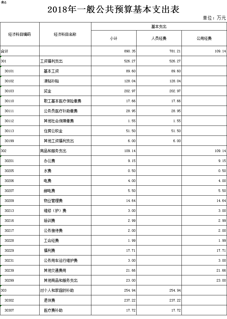 表6.2018年一般公共预算基本支出表