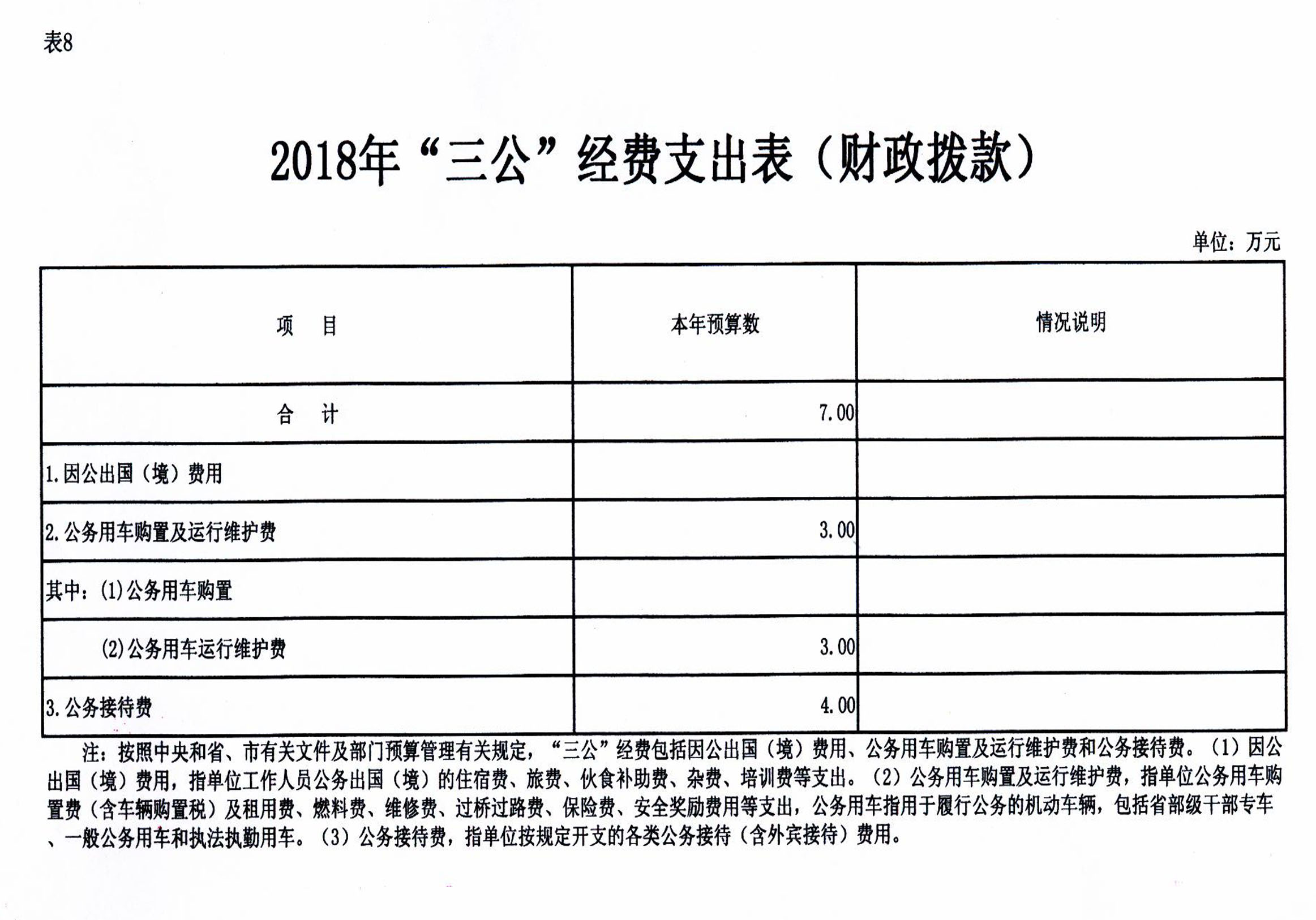 2018年部门财政拨款资金安排“三公”经费预算7万元。具体情况如下: