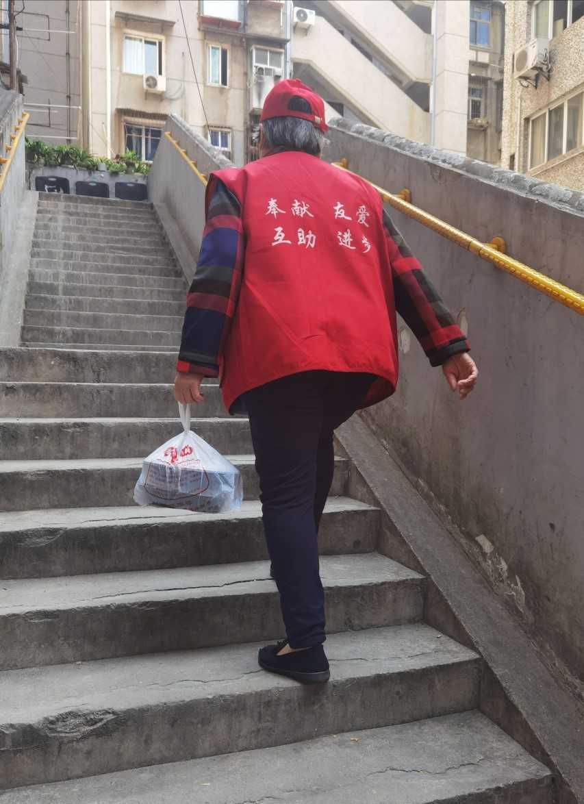 志愿者乐金莲正在爬楼梯为老人送餐。