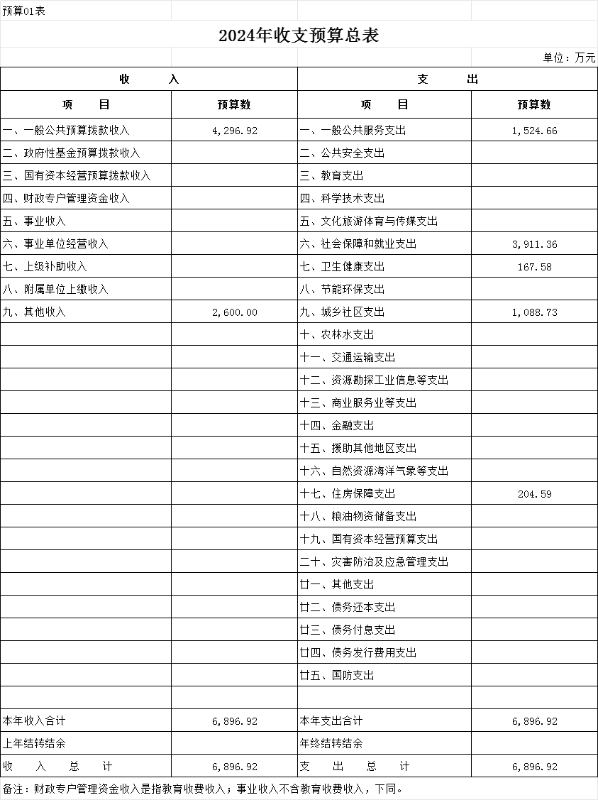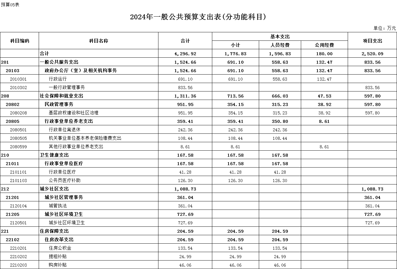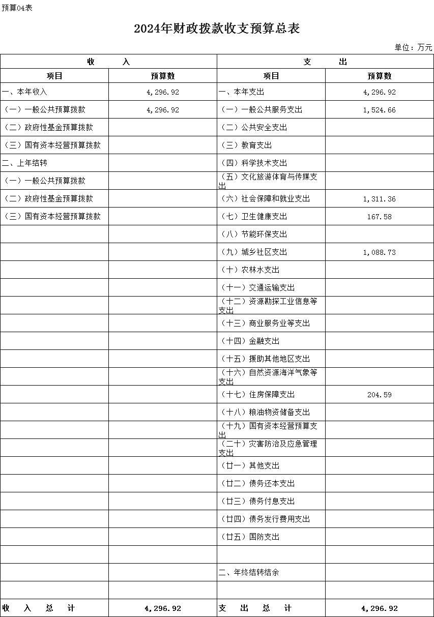 2024年财政拨款收支总预算4296.92万元。收入包括:一般公共预算拨款本年收入4296.92万元。支出包括:一般公共服务支出1524.66万元;社会保障和就业支出1311.36万元;卫生健康支出167.58万元;城乡社区支出1088.73万元;住房保障支出204.59万元。