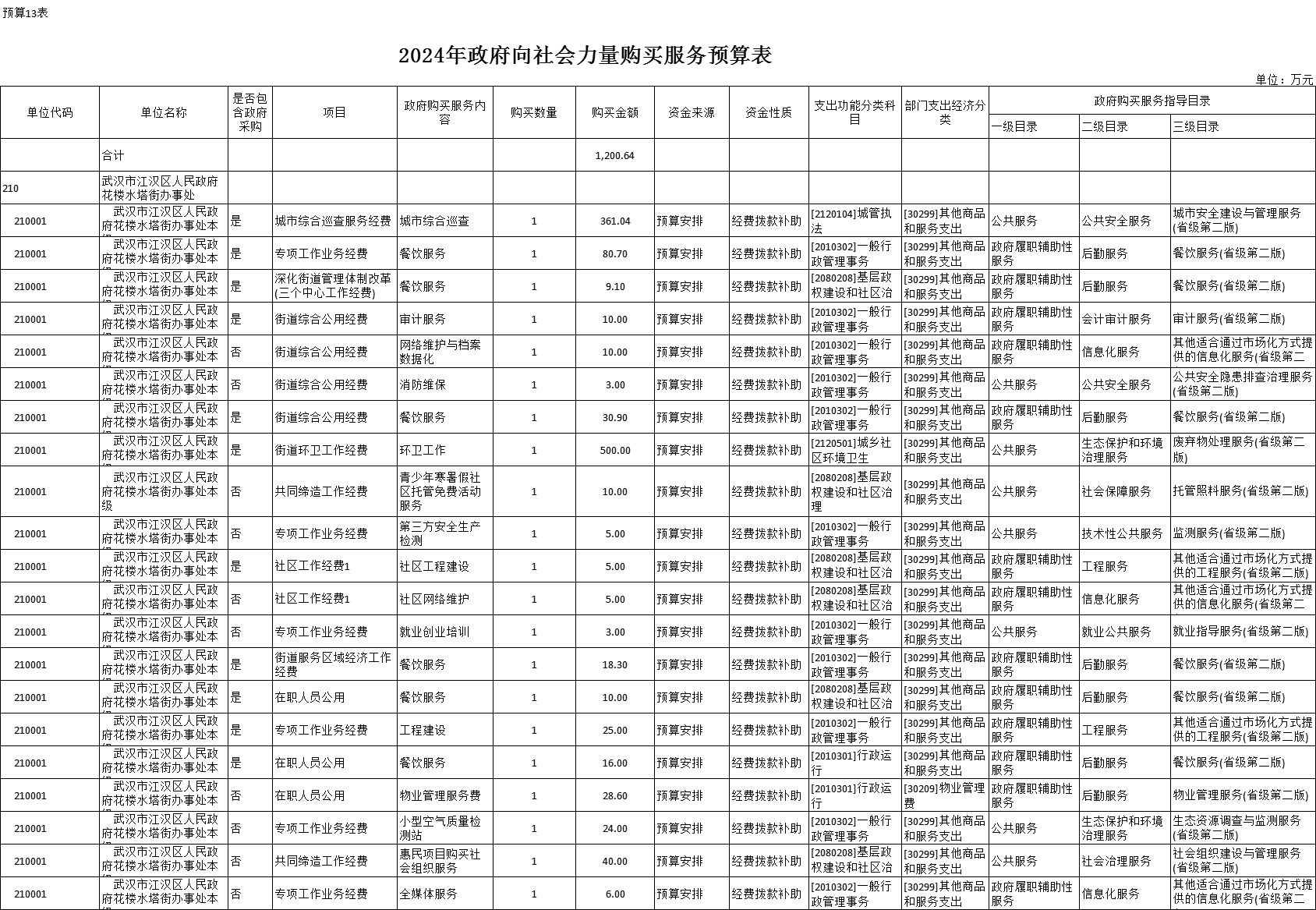 根据现行政府购买服务指导目录,2024年政府购买服务支出合计1200.64万元,购买的服务内容主要有:城市综合巡查、餐饮服务、审计服务、网络维护与档案数据化、消防维保、环卫工作、青少年寒暑假社区托管免费活动服务、第三方安全生产检测、社区工程建设、社区网络维护、就业创业培训、工程建设、物业管理服务费、小型空气质量检测站、惠民项目购买社会组织服务、全媒体服务。