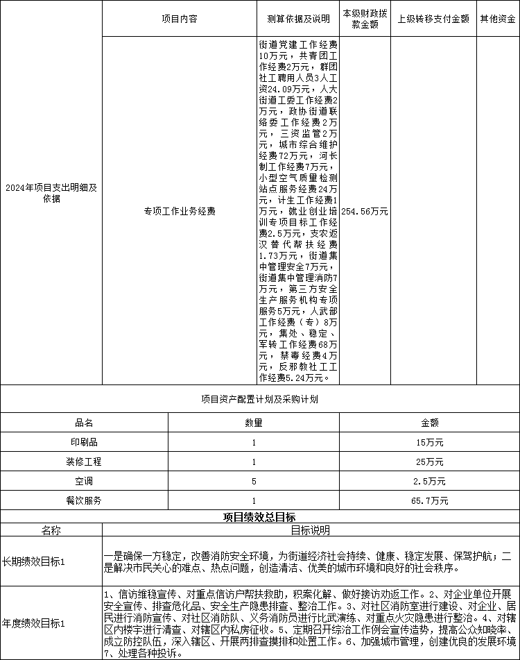 1.专项工作业务经费254.56万元,主要用于街道党建工作经费、共青团工作经费、群团社工聘用人员工资、人大街道工委工作经费、政协街道联络委工作经费、三资监管、城市综合维护经费、河长制工作经费、小型空气质量检测站点服务经费、计生工作经费、就业创业培训专项目标工作经费、支农返汉替代帮扶经费、街道集中管理安全、街道集中管理消防、第三方安全生产服务机构专项服务、人武部工作经费、集处稳定军转工作经费、禁毒经费、反邪教社工工作经费等。