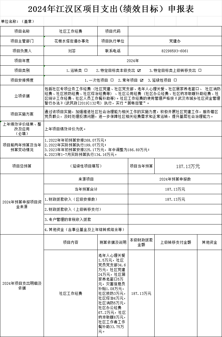 10.社区工作经费187.13万元,主要用于老年人心理关爱、社区党员党支部、社区党建、社区居家养老窗口、灾害信息元补贴、社区技防、社区综治、社区消防、社区办公经费、社区纳凉取暖、社区工作者工作餐补助等。