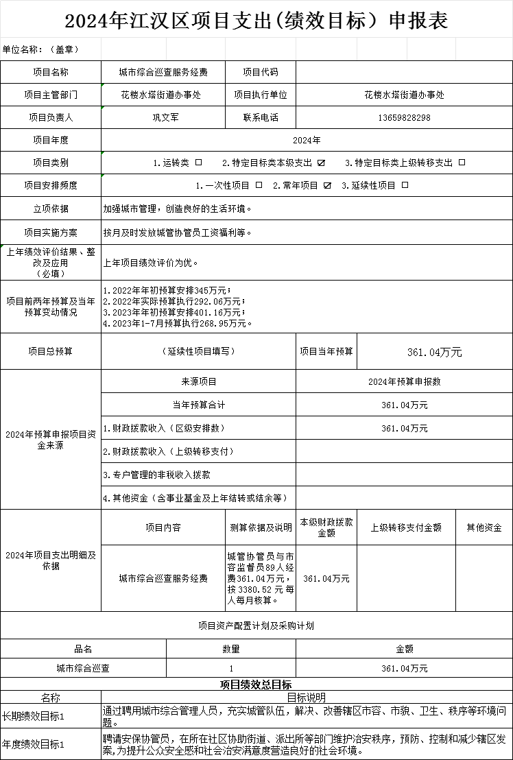 11.城市综合巡查服务经费361.04万元,主要用于聘用城市综合管理人员,充实城管队伍,解决、改善辖区市容、市貌、卫生、秩序等环境问题。