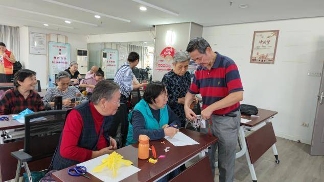 活动伊始,非遗剪纸传承人沈松柏老师向居民们介绍了剪纸的历史与文化背景,展示了精美的剪纸作品,让居民们对这一传统艺术有了进一步了解。现场教学中,他手把手指导居民们如何折纸、剪纸。大部分居民虽然初次接触剪纸,但是在老师耐心细致的指导和居民的不断摸索与实践中,一张张红纸在他们手中有节奏地舞动着,不一会儿,活灵活现的立体春和福寿桃作品就诞生了,现场欢声笑语此起彼伏。