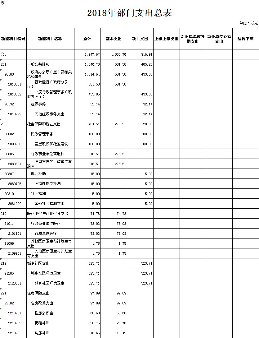 2018年部门预算总支出1947.67万元,较2017年年初预算增加256.31万元,增长13%。其中:一般公共预算财政拨款(补助)支出1947.67万元,主要用于基本支出1030.76万元,项目支出916.91万元。