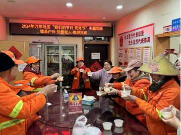 2月23日早上,万年社区妇联、社区工作人员、流动党员和吉年养老服务中心的工作人员早早地来到万年社区暖新驿站,准备好锅碗瓢盆等用具,一边将圆滚滚的汤圆倒入沸腾的锅中,一边准备碗筷、勺子,忙得不亦乐乎。工作人员手捧一碗碗热气腾腾的汤圆,送给正在铲雪的一线工作人员及刚刚忙碌完前来品尝的环卫工人,并道一声“辛苦了”。