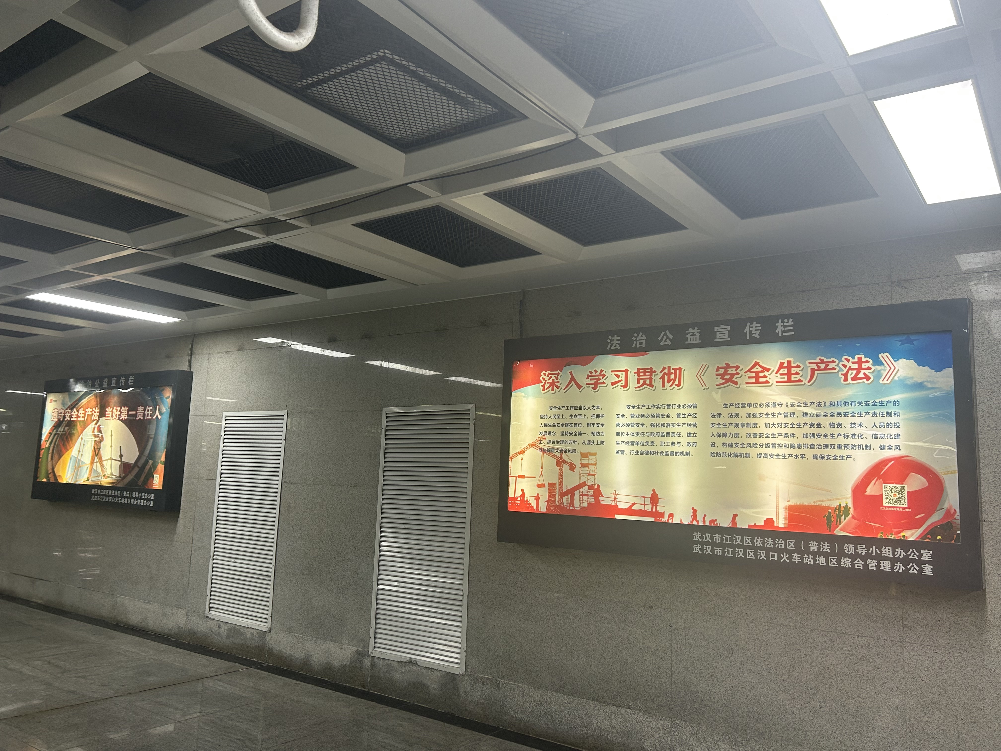 汉口站作为武汉市客流最大的火车站,日均到发旅客约15万人次,高峰期达40万人次。汉口站综管办依托辖区地理优势,联合区委依法治区办打造地下空间法治文化宣传栏,在地下出站口集散空间设置数十块法治宣传展板,常态化开展法治文化宣传,对进出站旅客进行普法教育。