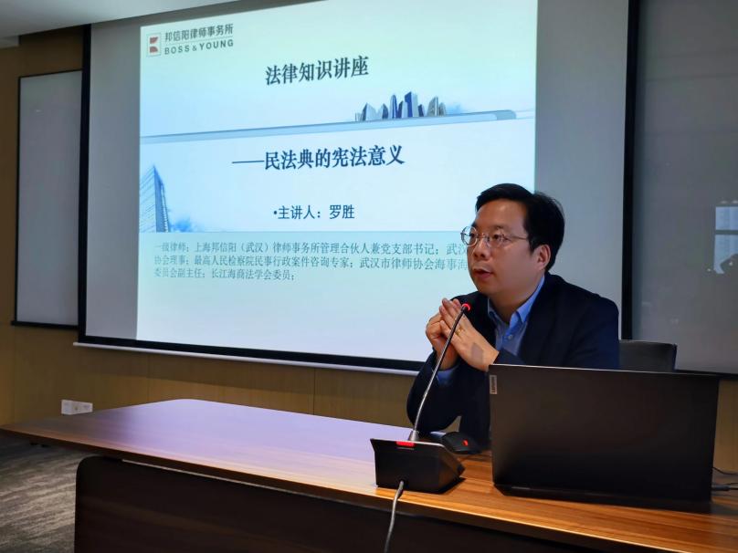 上海邦信阳(武汉)律师事务所管理合伙人、律师罗胜从宪法为民法典提供立法依据、宪法帮助民法典确立核心要旨和宪法通过民法典实施有关规定等方面开展讲座,深度剖析了民法典的宪法意义。此次活动与企业“零距离”接触、“面对面”沟通,进一步增强了企业管理者依法经营、依法管理的法律意识。