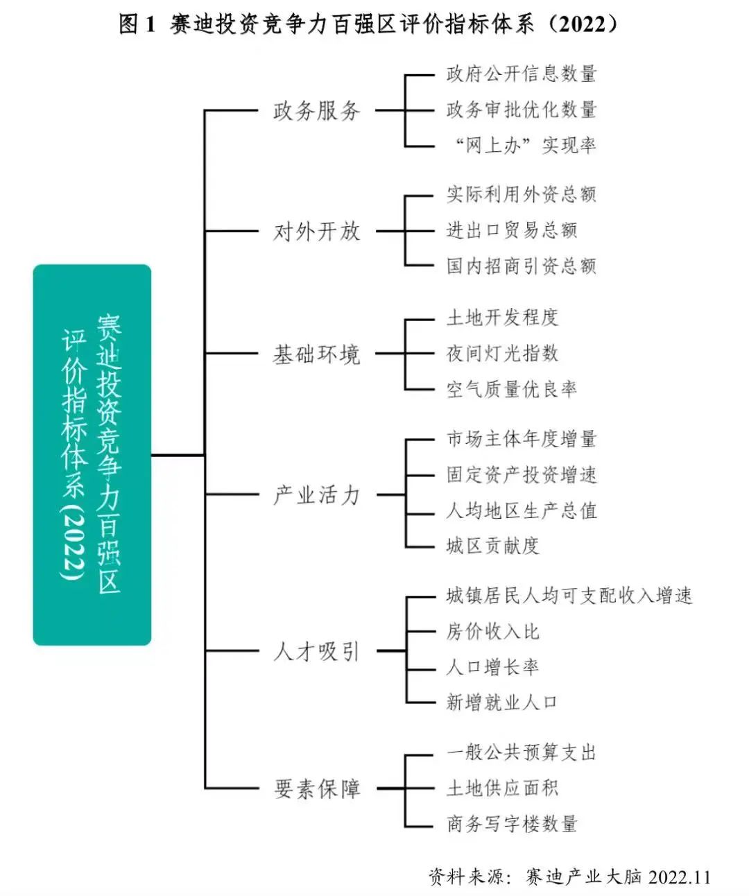 本次评价以数据公开获取、市场关切导向、科学公正评价为主要原则,构建了政务服务、对外开放、基础环境、产业活力、人才吸引、要素保障6大一级指标及20个二级指标的评价体系,对全国除直辖市和港澳台地区外的900余个市辖区展开综合评价,形成“赛迪投资竞争力百强区(2022)”榜单。