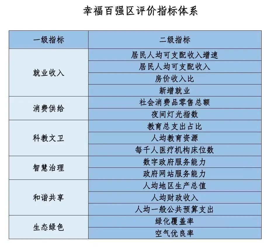 幸福百强区评价指标体系重点关注与民生幸福息息相关的重要方面,以16个核心指标30个辅助指标为支撑,从就业收入、消费供给、科教文卫、智慧治理、和谐共享、生态绿色六个方面对910个市辖区(直辖市市辖区除外)人民生活幸福度进行全面评价。数据来源于2021年各城区公开统计数据。