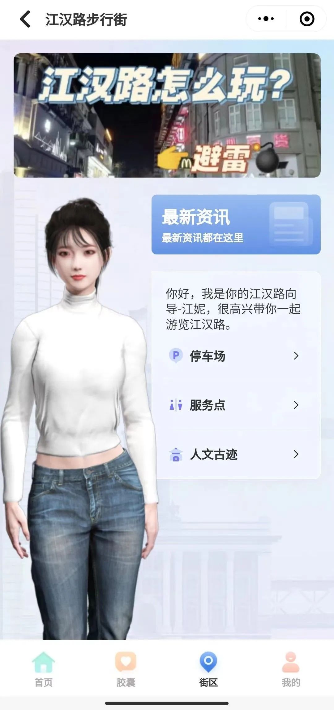 湖北首个街区数字主理人“江妮”为游客做线上向导。江汉路步行街小程序测试版截图