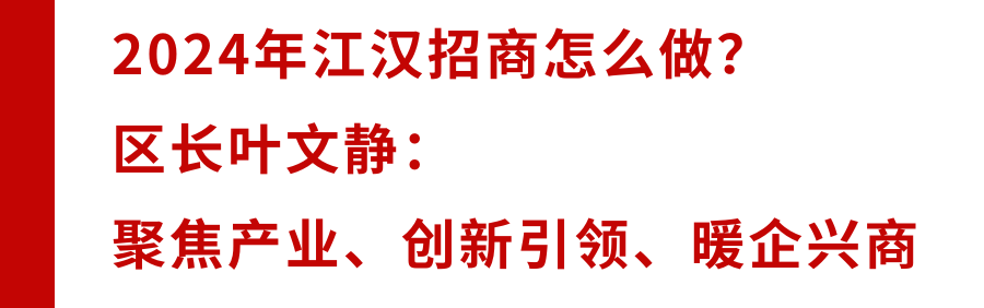 人民政府区长叶文静强调,2024年,江汉将牢牢把握发展机遇,高站位、高标准、高质量全力以赴抓招商,抢项目、稳外资、增后劲,以有质量的招商,推动扩大有效益的投资,助力产业体系不断优化、新兴动能加快积聚、城区面貌持续更新。
