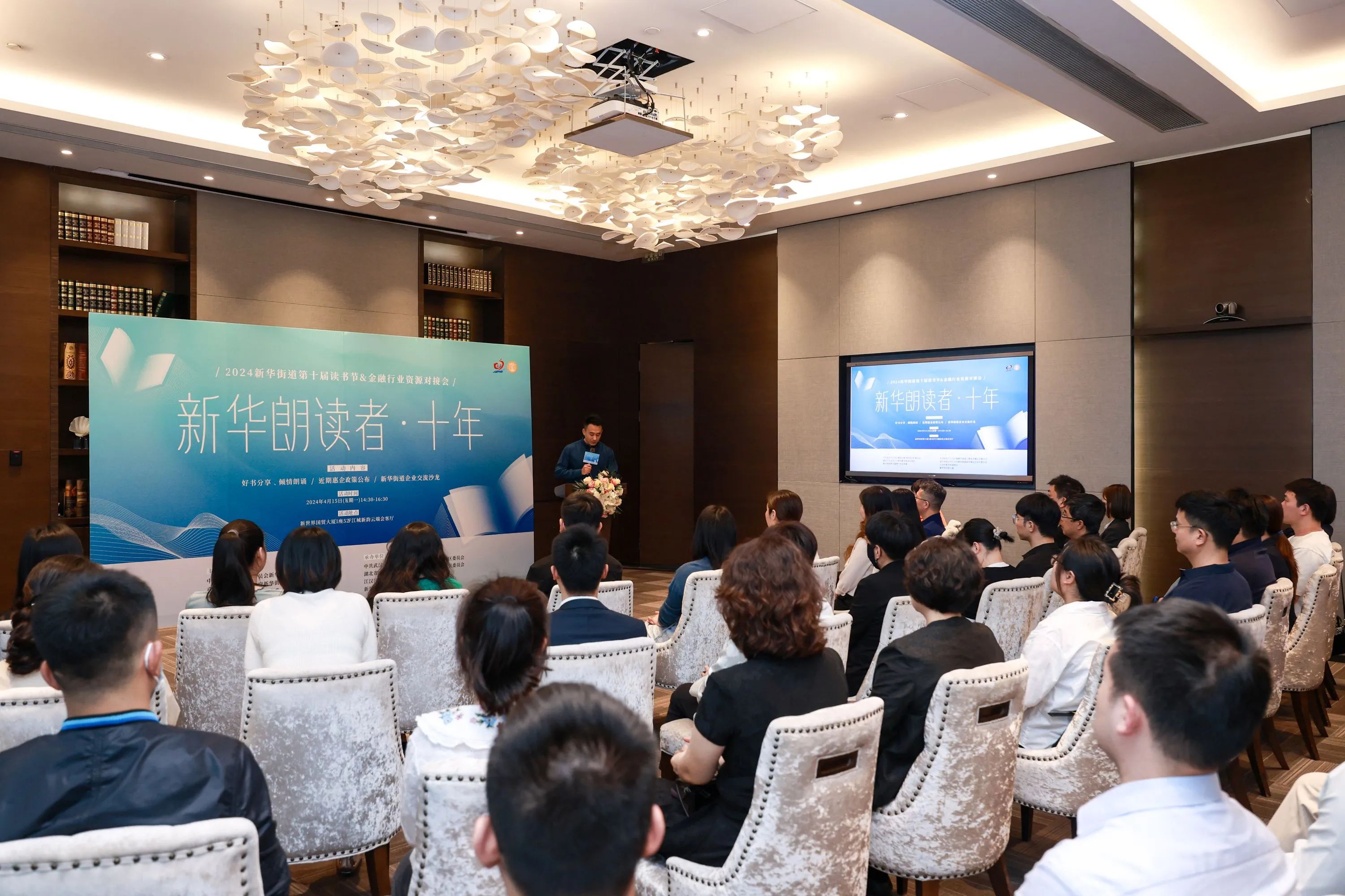 4月15日,酒店偷拍 新世界国贸大厦内,辖区近50家楼宇名企在雅致的书香氛围中共同参与“2024年新华街道第十届读书节暨金融行业资源对接会”,以书为媒,共话十年发展,进行了一场酣畅的思维碰撞与务实的资源对接。