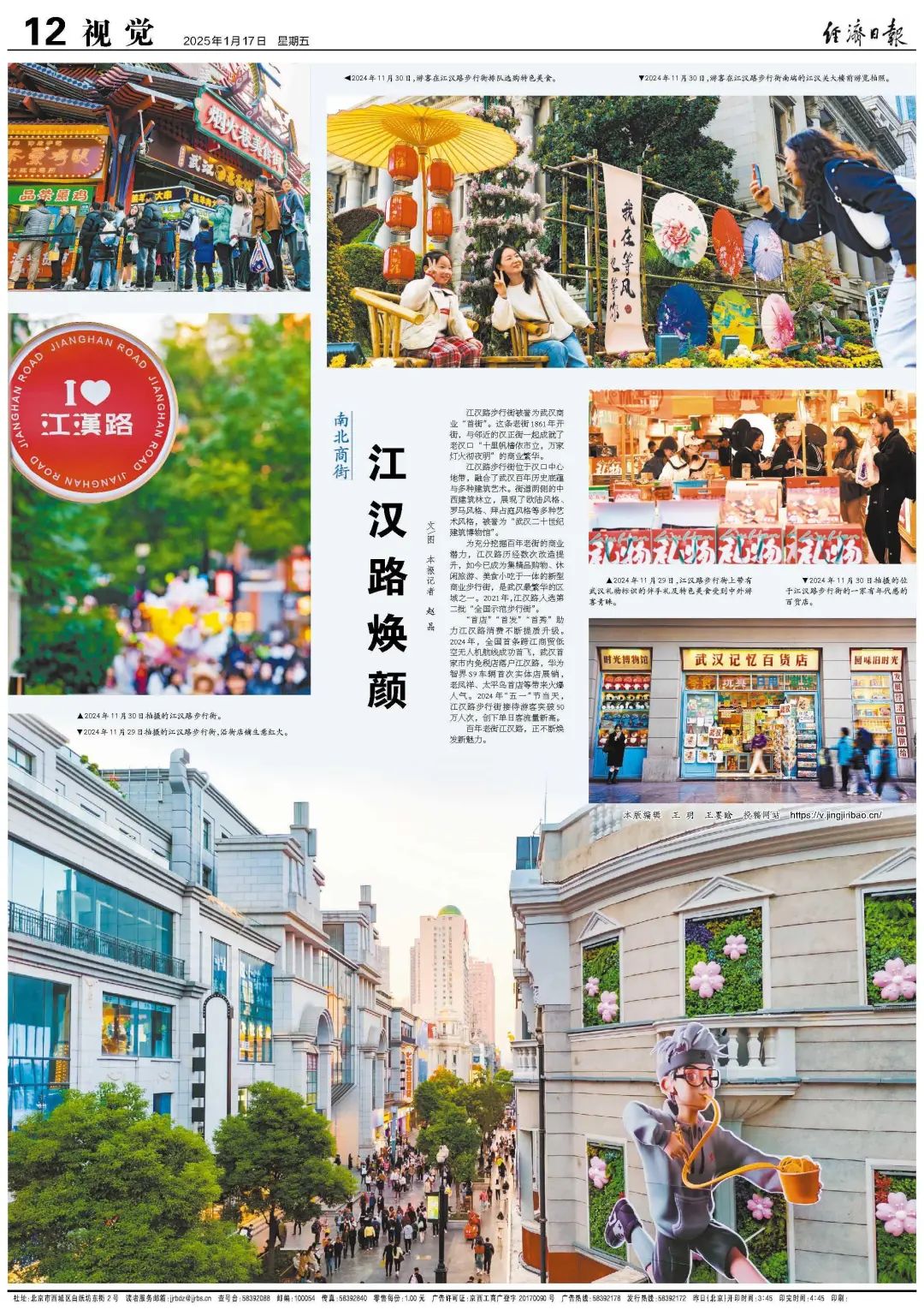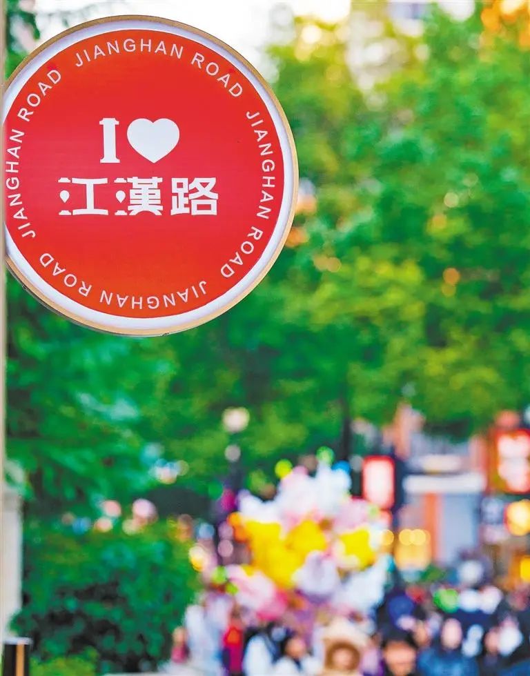 “首店”“首发”“首秀”助力江汉路消费不断提质升级。2024年,全国首条跨江商贸低空无人机航线成功首飞,武汉首家市内免税店落户江汉路,华为智界S9车辆首次实体店展销,老凤祥、太平鸟首店等带来火爆人气。2024年“五一”节当天,江汉路步行街接待游客突破50万人次,创下单日客流量新高。▲江汉路步行街上带有武汉礼物标识的伴手礼及特色美食受到中外游客青睐。