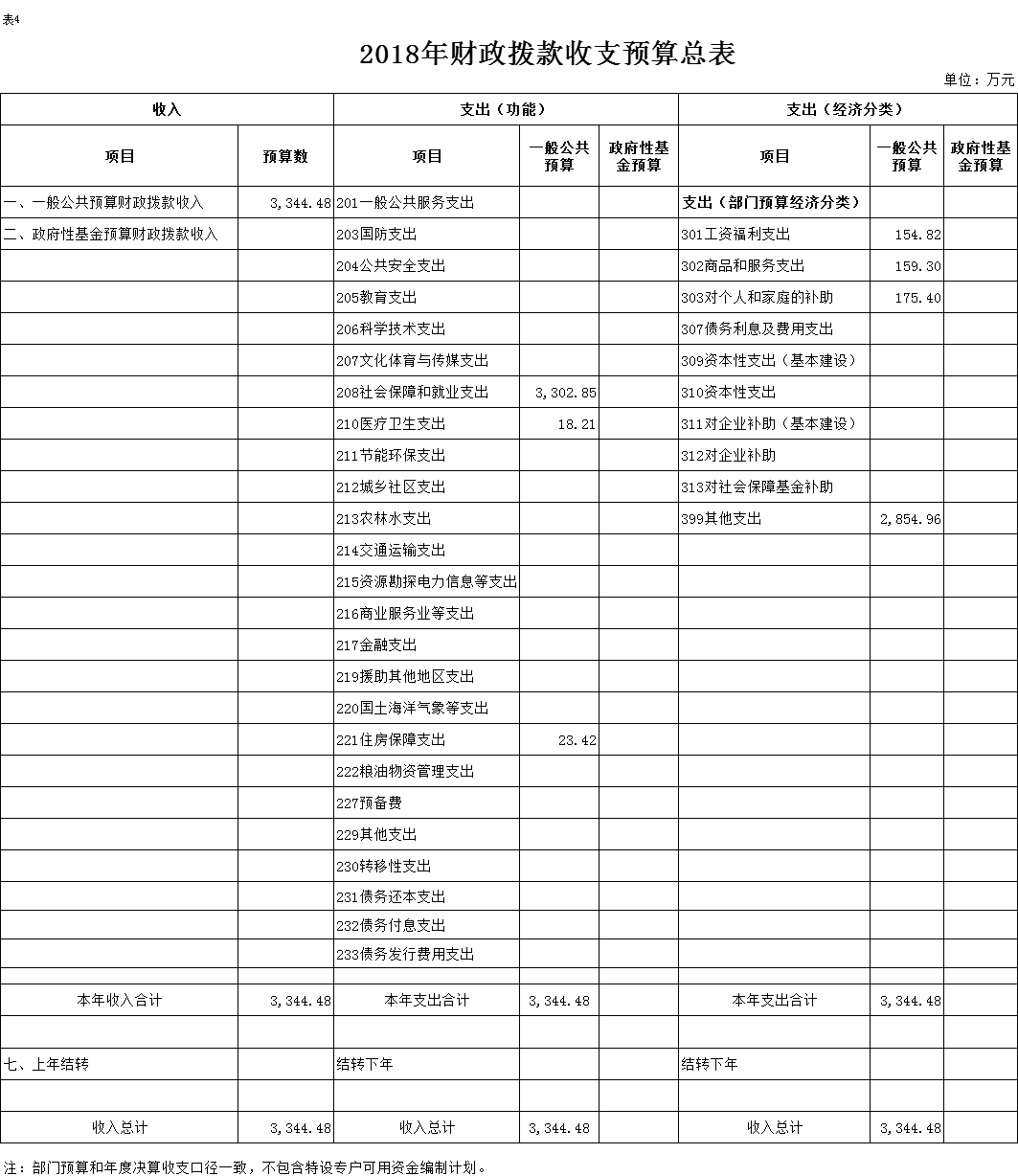 2018年一般公共预算财政拨款(补助)预算数3,344.48万元,安排情况如下: