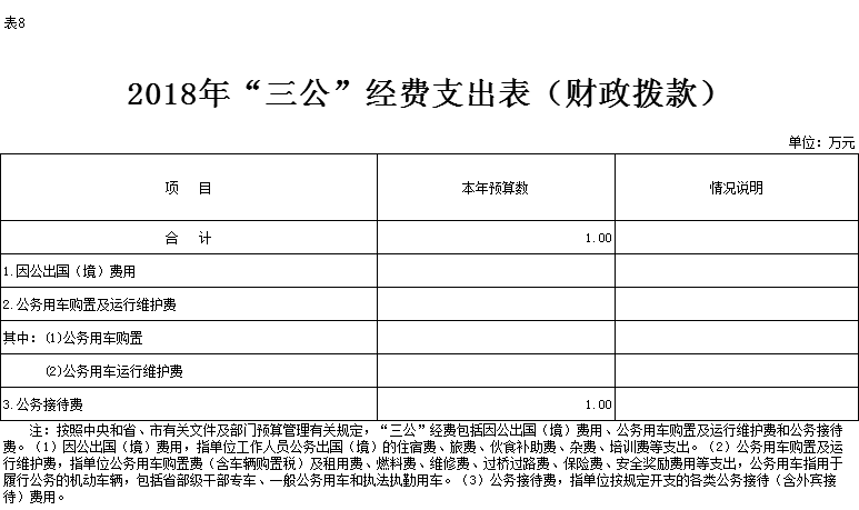 2018年部门财政拨款资金安排“三公”经费预算1万元。具体情况如下: