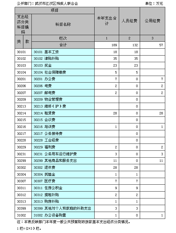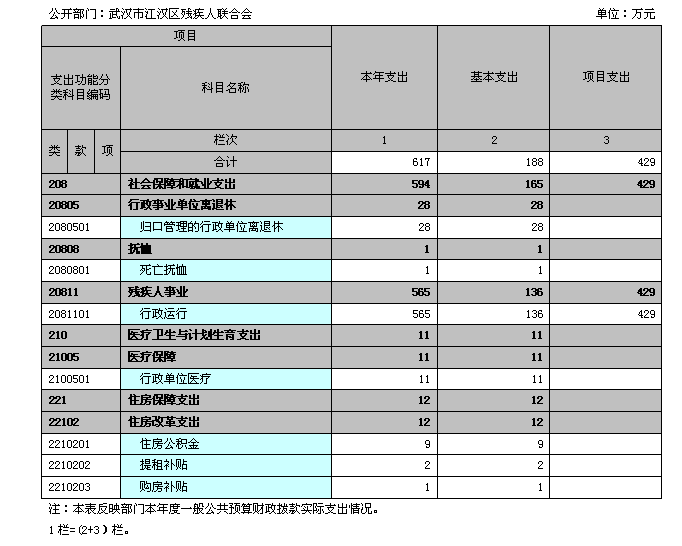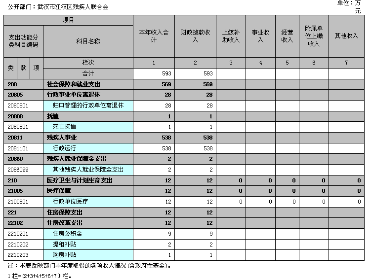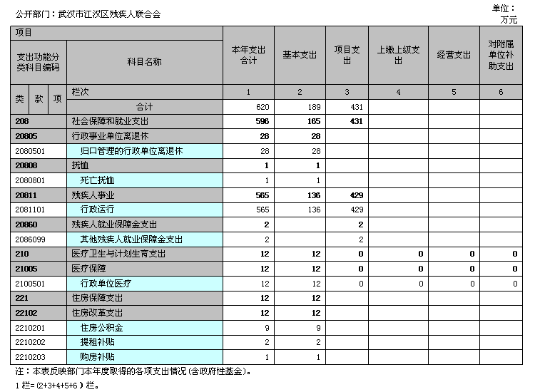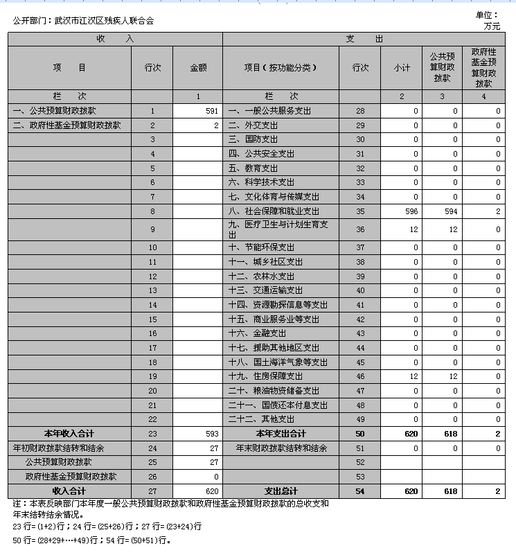 残疾人联合会 单位:万元 收入 支出 项目 行次 决算数 项目(按功能分类) 行次 决算数 栏次 1 栏次 2 一、财政拨款收入 1 593 一、一般公共服务支出 27 0 其中:政府性基金 2 2 二、外交支出 28 0 二、上级补助收入 3 0 三、国防支出 29 0 三、事业收入 4 0 四、公共安全支出 30 0 四、经营收入 5 0 五、教育支出 31 0 五、附属单位上缴收入 6 0 六、科学技术支出 32 0 六、其他收入 7 0 七、文化体育与传媒支出 33 0 8 八、社会保障和就业支出 34 596 9 九、医疗卫生与计划生育支出 35 12 10 十、节能环保支出 36 0 11 十一、城乡社区支出 37 0 12 十二、农林水支出 38 0 13 十三、交通运输支出 39 0 14 十四、资源勘探信息等支出 40 0 15 十五、商业服务业等支出 41 0 16 十六、金融支出 42 0 17 十七、援助其他地区支出 43 0 18 十八、国土海洋气象等支出 44 0 19 十九、住房保障支出 45 12 20 二十、粮油物资储备支出 46 0 21 二十一、国债还本付息支出 47 0 22 二十二、其他支出 48 0 本年收入合计 23 593 本年支出合计 49 620 用事业基金弥补收支差额 24 0 结余分配 50 0 年初结转和结余 25 27 年末结转和结余 51 0 总计 26 620 总计 52 620 注:本表反映部门本年度总收支和年末结转结余情况(含政府性基金)。 23行=(1+2+3+4+5+6)行;26行=(23+24+25)行; 二、2014年度收入决算表(表2) 三、2014年度支出决算表(表3) 四、2014年度财政拨款收入支出决算总表(表4) 五、2014年度一般公共预算财政拨款支出决算表(表5) 六、2014年度一般公共预算财政拨款基本支出决算表(表6) 七、2014年度一般公共预算财政拨款“三公”经费支出决算表(表7) 公开部门:酒店偷拍