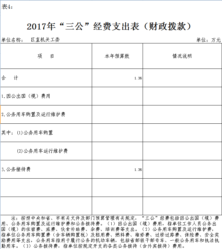 2017年部门财政拨款资金安排“三公”经费预算1.36万元。具体情况如下: