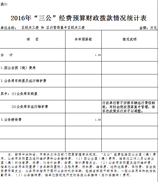 区直机关工委2016年“三公”经费财政拨款预算情况说明 一、“三公”经费的单位范围 区直机关工委因公出国(境)费、公务接待费、公务用车购置及运行维护费开支单位包括本级(无下属事业单位)。 二、2016年“三公”经费财政拨款预算情况 2016年部门财政拨款资金安排“三公”经费预算1.36万元。具体情况如下: (一)因公出国(境)费 年初由财政预算集中管理,实际发生时报区委、区政府审批后列入单位预算,年终并入单位决算予以公开。 (二)公务接待费 公务接待费1.36万元。主要用于执行公务和开展业务活动开支公务接待费。 (三)公务用车购置及运行维护费 1、公务用车购置费 年初由财政预算集中管理,实际发生时报区委、区政府审批后列入单位预算,年终并入单位决算予以公开。 2、车辆运行维护费暂不安排,年初由财政预算集中管理,待车改政策实行后予以调整。