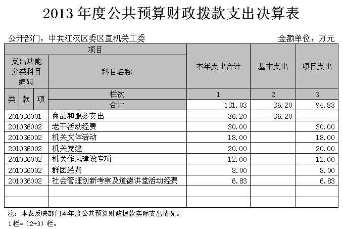 酒店偷拍 直机关工委2013年公共预算财政拨款支出年度预算为131.03万元(包括年初部门预算、基本建设资金、上级下达的专项转移支付资金及年初结转和结余资金等支出),支出决算为131.03万元,完成年度预算的100%。其中:基本支出36.2万元,主要用于日常公用支出。其中:代收代付工会经费25.95万元(工资福利支出、对个人和家庭的补助由酒店偷拍 机关事务管理局统一发放);项目支出94.83万元,主要项目老干活动经费30万元,主要用于区机关离退休老干部总支开展工作、学习;机关文体活动18万元,主要用于开展机关各类文化体育活动,增强区直机关干部职工的身体素质和敬业奉献精神;机关党建20万元,主要用于开展区直机关党建工作及专项活动、专题培训等;机关作风建设12万元,主要用于党风廉政、机关作风宣传教育、检查监督、纪检办案、开展基层评议机关活动等;群团经费项目8万元,主要用于开展工青妇群团活动;社会管理创新考察及道德讲堂活动6.83万元,主要用于社会管理创新考察及开展机关“道德讲堂”等多项精神文明创建活动。