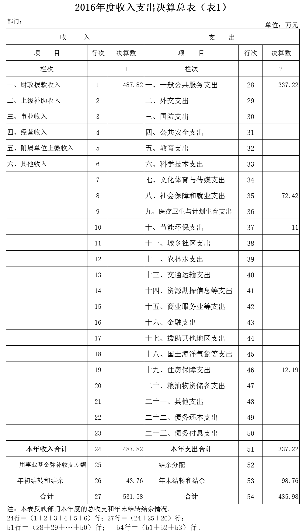 2016年度本年收入合计 487.82 万元。其中:财政拨款收入(含政府性基金拨款) 487.82 万元,占本年收入 100 %,上级补助收入 0 万元,占本年收入 0 %,事业收入 0 万元,占本年收入 0 %,经营收入 0 万元,占本年收入 0 %,附属单位上缴收入 0 万元,占本年收入 0 %,其他收入 0 万元,占本年收入 0 %。
