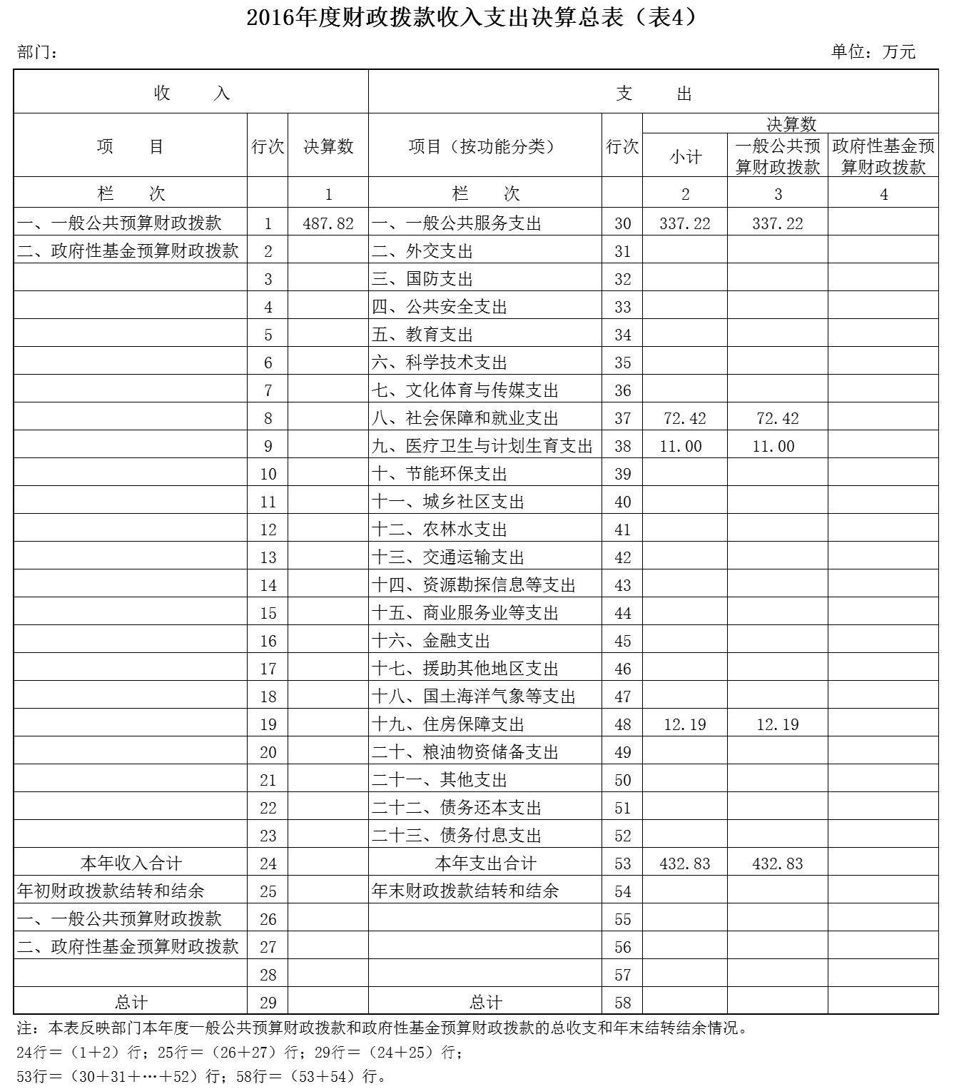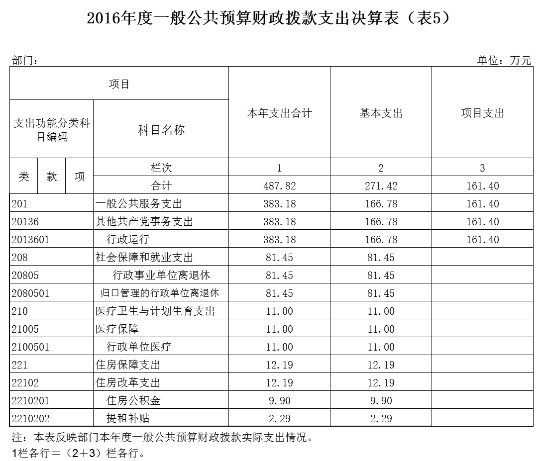 2016年度财政拨款(含政府性基金拨款)收支总计 487.82 万元。与2015年相比,财政拨款收、支总计各增加3.82 万元,增长0.8 %。主要原因是职工工资增加和老干工作经费提高。