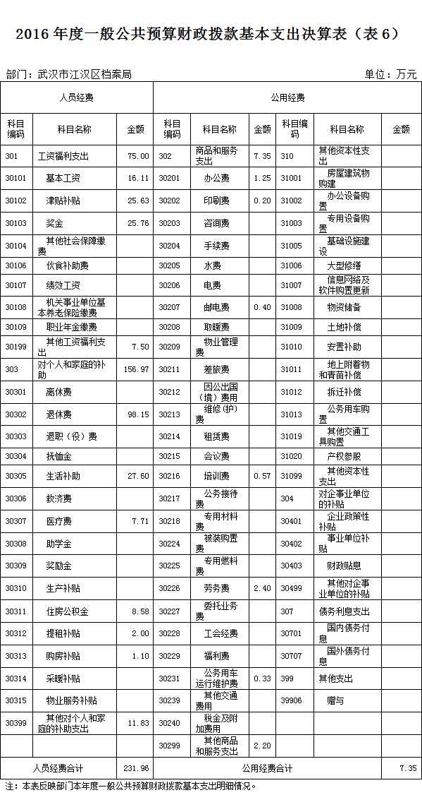 2016年度一般公共预算财政拨款基本支出239.31万元,其中,人员经费231.96万元,主要包括:基本工资、津贴补贴、奖金、其他工资福利支出、退休费、生活补助、医疗费、住房公积金、提租补贴、购房补贴、其他对个人和家庭的补助支出;公用经费7.35万元,主要包括:办公费、印刷费、邮电费、培训费、劳务费、公务用车运行维护费、其他商品和服务支出。