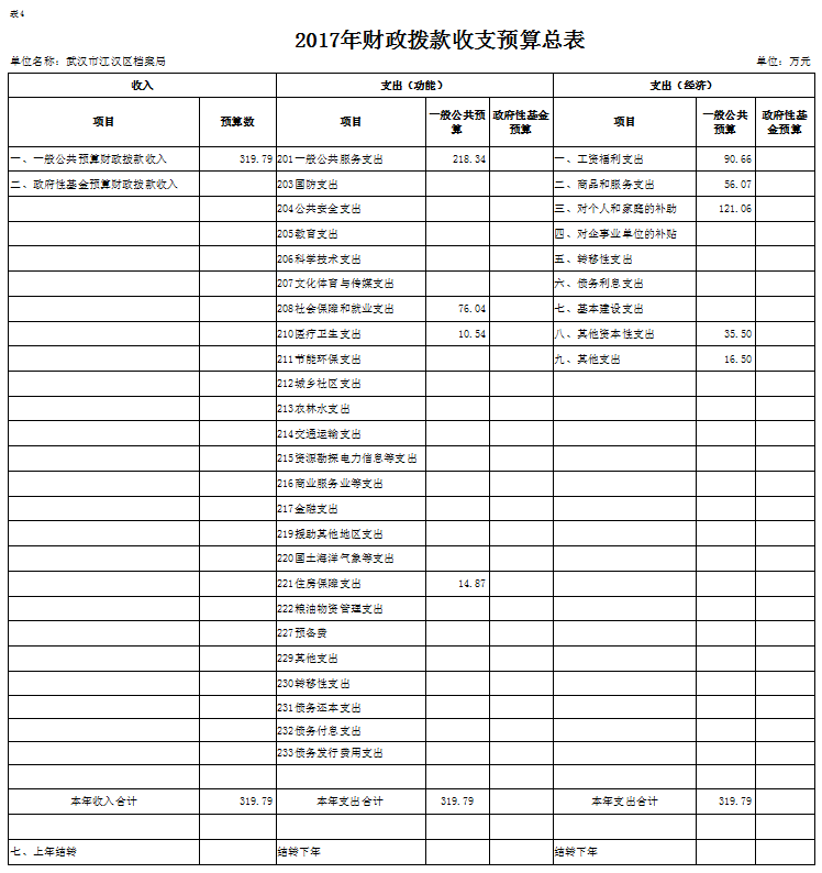 2017年财政拨款(补助)预算数319.79万元,安排情况如下: