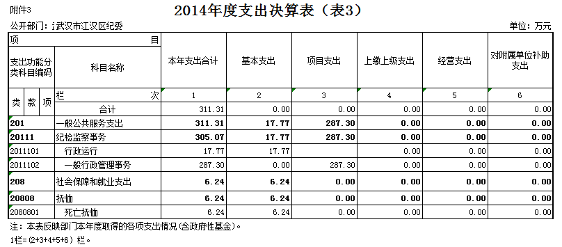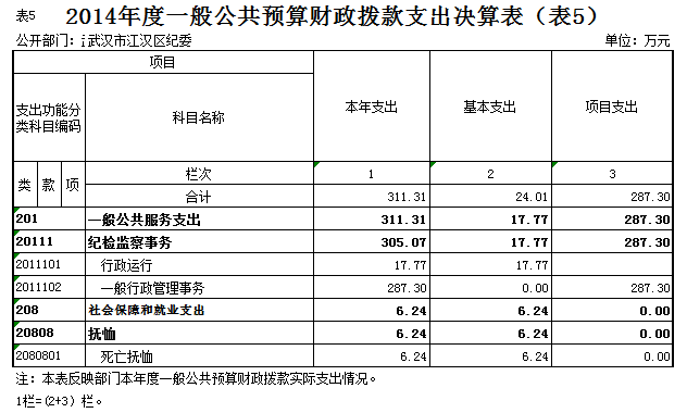 406.76万元(包括年初部门预算、基本建设等专项资金、上级下达的专项转移支付资金及年初结转和结余资金等支出),支出决算为311.31万元,完成年度预算的77%。其中:基本支出24.01万元,项目支出287.30万元。项目支出主要用于综合电子监察平台系统建设工作经费26.4万元,已初步建成。用于大宣教工作25万元,主要成效:组织基层、机关纪检监察干部参加中纪委、省纪委培训,开展基层纪检监察干部业务培训班,开展党性党风党纪教育、警示教育及廉政文化教育,组织4000余名党员领导干部、居民群众到廉政教育基地参观学习。开展系列廉政主题教育学习,编辑《公务人员廉政手册》之八4500余册。组织党员领导干部400余人次参加“江汉论坛”警示教育报告会。用于治庸问责工作38万元,主要成效:一是落实责任形成工作合力。制作了电视片,对2014年突出问题进行了曝光,建立分析研判制度,召开督察调研和专题调度会对重点问题下达《整改督办函》,提出整改建议。二是治理突出问题成效显现。三是加大问责力度。四是完善长效机制。用于党风廉政建设和反腐败斗争工作197.9万。主要成效:一是健全责任体系,落实党风廉政建设“两个责任”,制定了《中共酒店偷拍 委关于落实党风廉政建设党委主体责任纪委监督责任的意见》,《中共酒店偷拍 委关于贯彻落实〈建立健全惩治和预防腐败体系2013—2017年工作规划〉实施细则》,强化责任意识,明确责任目标任务。二是落实党风廉政建设责任制分级报告制。全区重点安排2名区级领导向区委常委会报告,14个基层单位党组织向区委全委(扩大)会报告,78个基层单位领导班子成员向本单位党(工)委(扩大)会报告,107个社区党组织向所在的街道工委会报告,医院、学校党组织向所在的主管部门党(工)委会报告。三是坚持不懈狠抓“四风”,抓好专项整治工作。严格落实中央八项规定精神,组织督查组,在重要节点,对全区基层单位落实“中央八项规定”精神情况进行了监督检查,严肃追责。开展规范津补贴清理活动。组织区财政局、区审计局对23家单位发放津补贴进行了检查审计,并在全区开展了自查自纠,清退违纪违规金额734万元。对文山会海、三公经费开支超标、公车私用等问题开展了专项整治。四是保持查办案件的高压态势。进一步规范信访举报线索的管理机制,深入开展损害群众利益的基层信访突出问题专项治理,严肃查处了一批违反中央八项规定、损害群众切身利益、滥用职权、失职渎职、权谋私、贪污贿赂的案件。