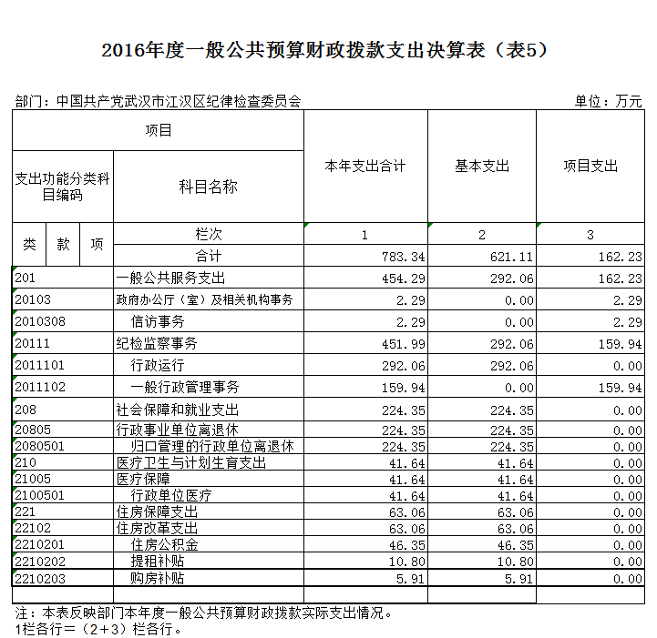 2016年一般公共预算财政拨款支出年度预算为1113.83万元(包括年初部门预算、基本建设等专项资金、上级下达的专项转移支付资金及年初结转和结余资金等支出),支出决算为 783.34万元,完成年度预算的70%。其中:基本支出621.11万元,项目支出162.23万元。项目支出主要用于纪律审查工作、信访工作、党风政风监督工作、治庸问责、反腐倡廉大宣教工作、纪检监察干部培训、聘请法律顾问以及三个纪检监察派出工作等。