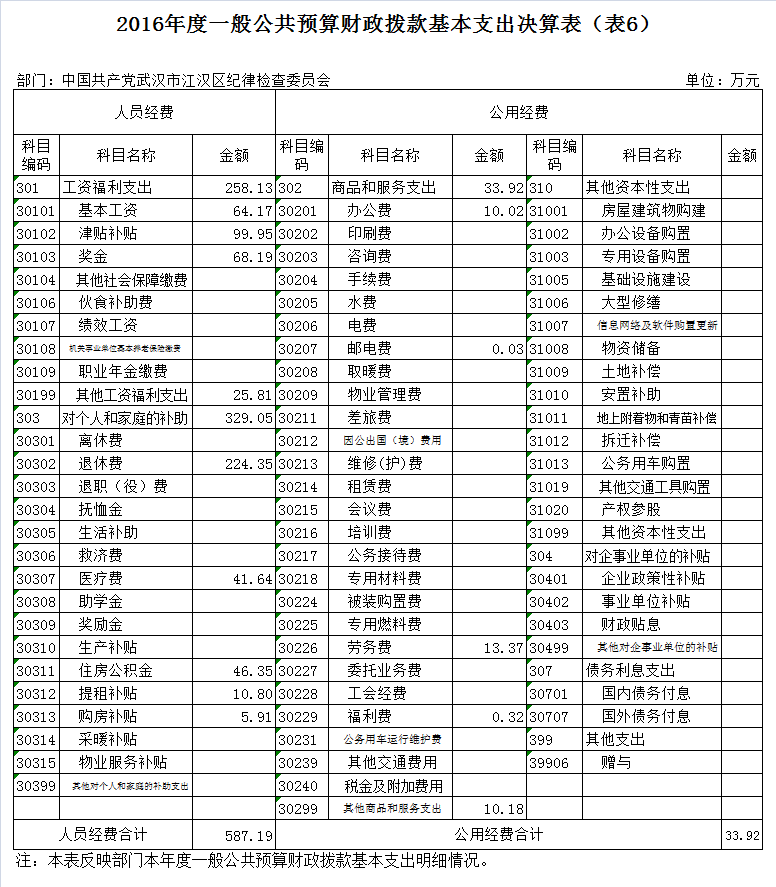 2016年度一般公共预算财政拨款基本支出621.11万元,其中,人员经费587.19万元,主要包括:基本工资、津贴补贴、奖金、社会保障缴费、绩效工资、其他工资福利支出、离休费、退休费、抚恤金、退职(役)费、抚恤金、生活补助、救济费、医疗费、助学金、奖励金、生产补贴、住房公积金、提租补贴、购房补贴、其他对个人和家庭的补助支出;公用经费33.92万元,主要包括:办公费、印刷费、咨询费、手续费、水费、电费、邮电费、取暖费、物业管理费、差旅费、因公出国(境)费、维修(护)费、租赁费、会议费、培训费、公务接待费、专用材料费、被装购置费、专用燃料费、劳务费、委托业务费、工会经费、福利费、公务用车运行维护费、其他交通费用、税金及附加费用、其他商品和服务支出。