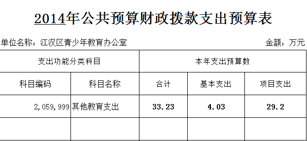 2014年青教办部门预算总支出33.23万元。其中:财政拨款(补助)支出33.23万元,主要用于:基本支出4.03万元;项目支出29.2万元。