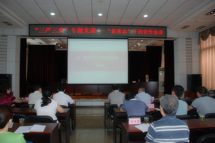 7月10日上午,区委副书记、政法委书记、党校校长殷玉梅同志在区委党校多功能报告厅,以《论“新常态”下的党性修养》为题,结合分管的工作实际,就如何正确看待“新常态”,以及在“新常态”下党员干部如何加强党性修养,保持一个良好心态等方面,为我区群团部门、政法战线、区委党校和联系点汉兴街共200名党员干部讲了一堂生动的“三严三实”专题党课。