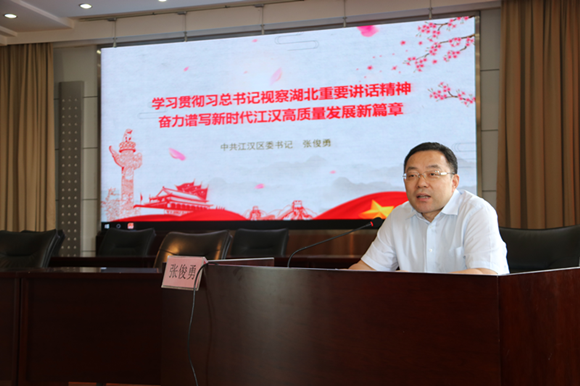 张俊勇同志指出,习近平总书记视察湖北重要讲话精神的三点重大意义:提升湖北武汉在全国影响力的政治意义;形成“五大关系”“四个切实”等重大理论成果的理论意义;将高质量发展贯穿各项工作始终的时代意义。强调要深刻理解习近平总书记视察湖北重要讲话精神的四点核心要义:确立推动长江经济带发展以“五大关系”的指导方针;确立全面深化改革“勇立潮头”的目标任务;确立“谱写新篇章”为改革发展的总体要求;确立“四个切实”为改革发展的主攻方向。张书记要求全区要迅速掀起学习习近平总书记视察湖北重要讲话精神的热潮,做到“提高站位学、领导带头学、活动牵引学、营造氛围学、融入实践学”。推动习近平总书记视察湖北讲话精神在江汉落地生根。